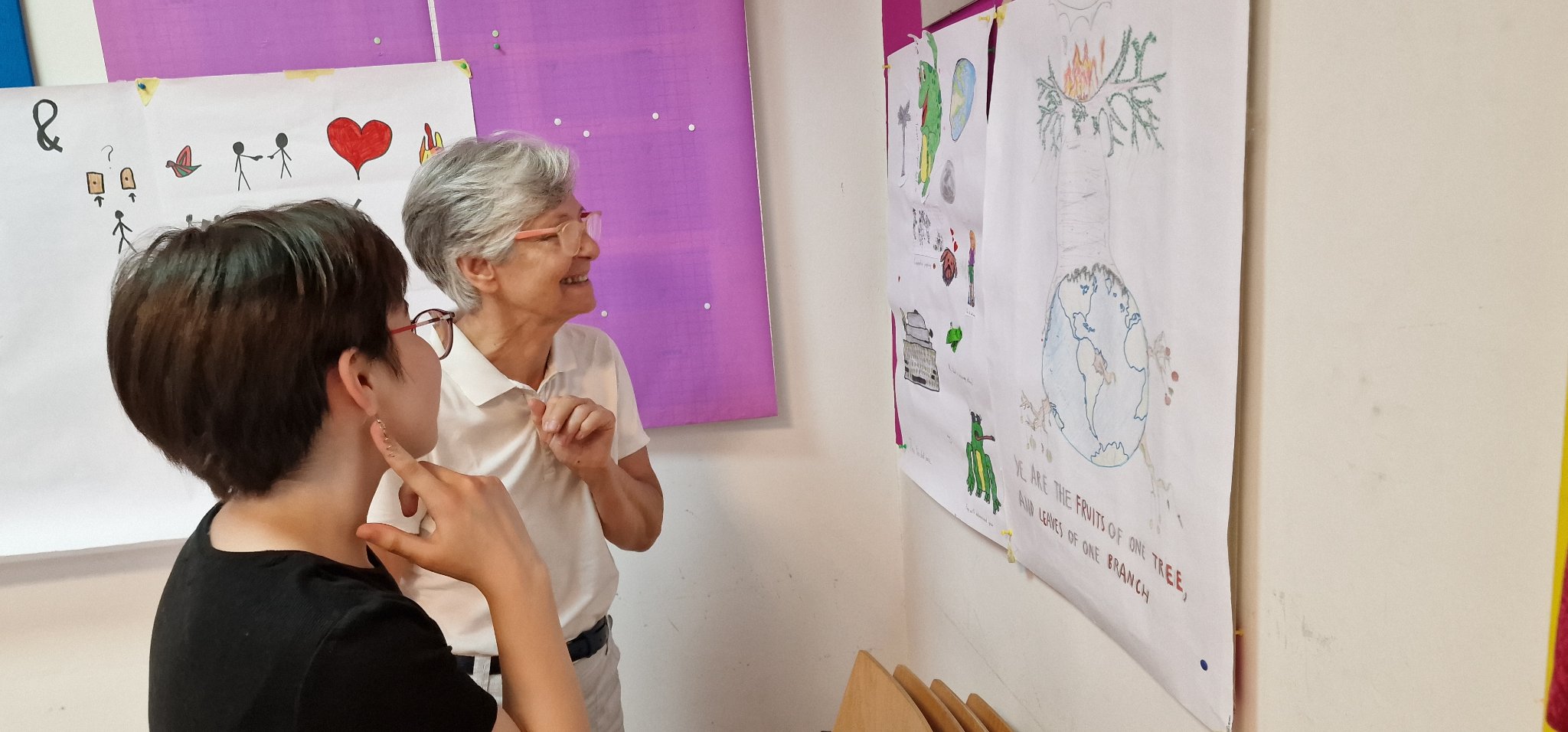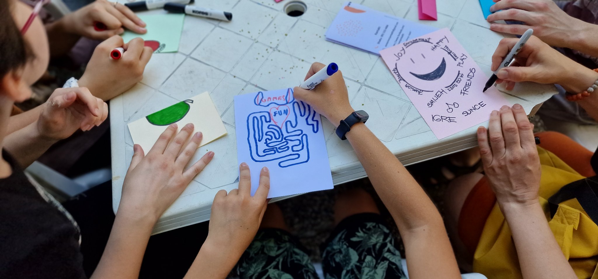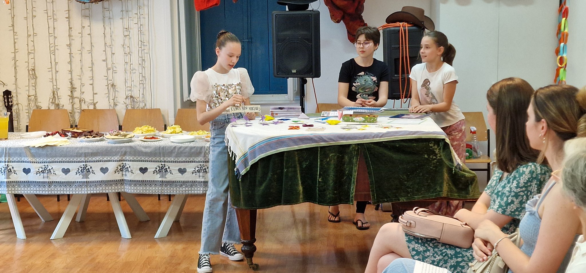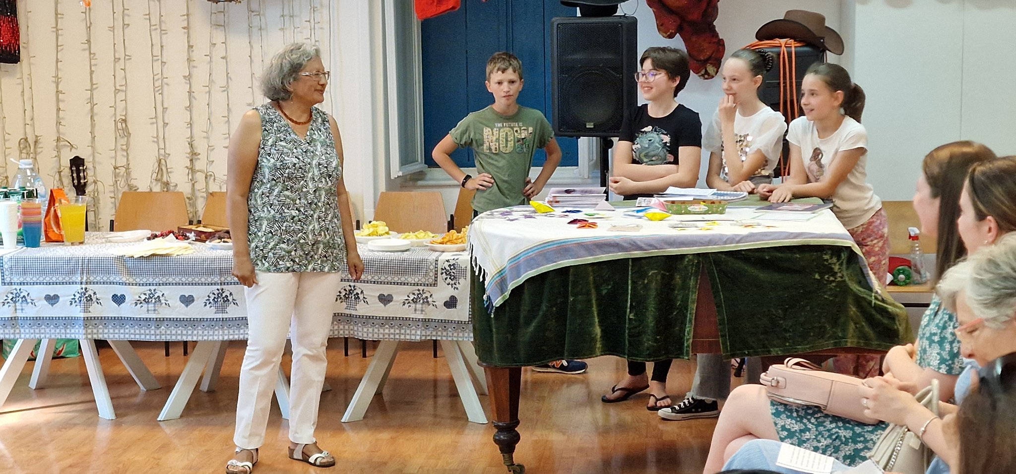 Ils ont présenté leurs apprentissages à l’audience, leur ont fait visité une exposition de leurs créations, les ont fait jouer plusieurs jeux coopératifs qu’ils avaient appris à jouer et à diriger, et les ont mis au travail dans un atelier de créations de cartes postales sur les thèmes de leur formation.